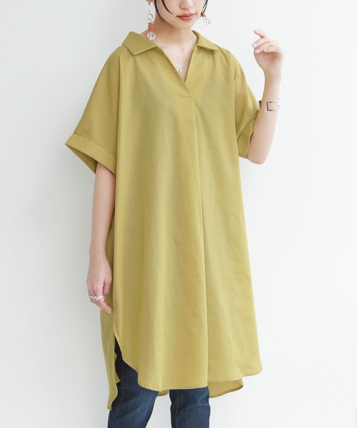 レイヤードスタイルも簡単に決まる。 スキッパー襟で抜け感を演出する、ゆるっとお洒落なチュニックブラウス。二の腕をカバーするこだわりの袖デザインも、コーデの味方になるポイントです。 さらりとした肌触りのコットン混素材を使用。 かっちりしすぎず、さらっと着られる柔らかなシャツ生地です。 薄手で程良い透け感があり、涼し気な装いに。 ≪n'OrLABEL≫スキッパーチュニック丈シャツブラウスです。
