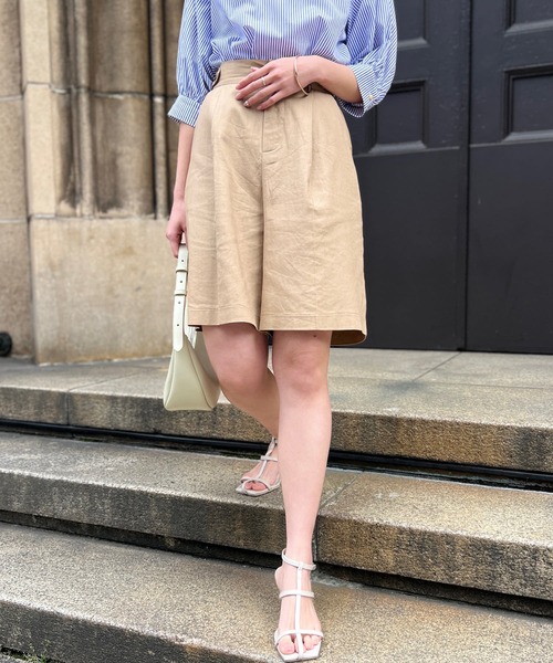 リネン混のきれいめハーフパンツ ■point 縦ラインをさり気なく強調してくれるセンタープレスとウエストサイドについたマーブルボタンがポイントのハーフパンツ。 大人女子が履いてちょうど良い、短すぎず長すぎない着丈バランスに仕上げました。 さらっとした涼し気なリネンとレーヨン混の素材が季節らしい着こなしに。 着こなしやすいシンプルなデザインなので、カジュアルになり過ぎず程よく抜け感のあるコーディネートを楽しんでいただけます。 【PGC1031307A0003 ミドルジレジャケット】とセットでの着用で、セットアップ風にも着ていただけます。 ■coordinate シャツやブラウスで合せて抜け感のある大人のラフさを出したコーディネートがオススメ。 Tシャツやノースリニットと合せたフェミニンな着こなしにもばっちりです◎ ■fabric 表地:レーヨン70%麻30% 裏地:ポリエステル100% -------------------------------------------------- 裏地:あり 光沢感:なし ポケット:あり 伸縮性:なし 生地の厚さ:普通 洗濯方法:手洗い可 -------------------------------------------------- ※商品画像は着用イメージです。 光や角度により、実物と色味が異なる場合がございます。また表示のサイズ感も実物とは若干異なる場合もございますので、ご了承ください。 ※着用、お取り扱いの際は、商品についている品質表示とアテンションタグを必ずご確認ください。 -------------------------------------------------- ♡をクリックでお得な情報をお知らせいたします。 <商品お気に入り登録> お気に入りアイテムのお値下げ・再入荷・在庫ラスト1点など通知を受けることができます。 <ブランドお気に入り登録> Chez toiの新商品・再入荷・SALE・クーポン配布などお得な情報を受けることができます。 -------------------------------------------------- Cheztoi/シェトワ フランス語で「あなたの家」という意味。 自分にまっすぐでそしてしなやかに生きる女性に向けたブランドです。