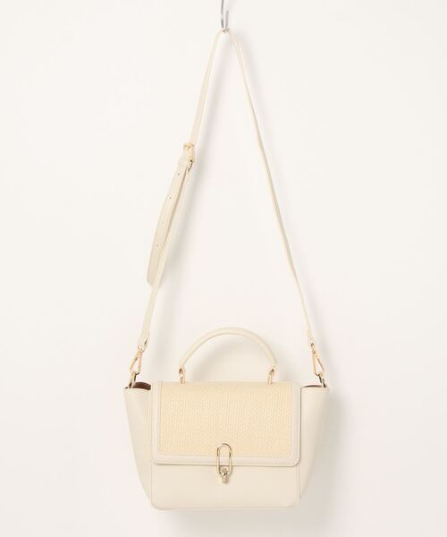 大人っぽい雑材MIXショルダーバッグ。フラップ部分の雑材ときらっと光る楕円形パーツが上品なポイント。留め具をひねると開閉する仕様、マチがあるので貴重品などのデイリーに必要なものが収納できます。肩掛けできるショルダー付き。