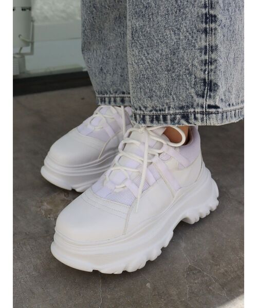 ■デザイン美脚見え間違いナシ!オリジナルの厚底スニーカーです。程よくボリュームのある履き口周りが脚を華奢に見せてくれます。■スタイリングカジュアルなスタイリングにはもちろん、ロングワンピなどの綺麗目なコーデにも。1点投入するだけで程よくカジュアルダウンできる優秀アイテムです。厚底ソールが特徴的なオリジナルスニーカーです。様々なスタイリングに合わせやすいシンプルなデザインになっているので、スポーティーなスタイリングやカジュアルダウンとしてもオススメです。