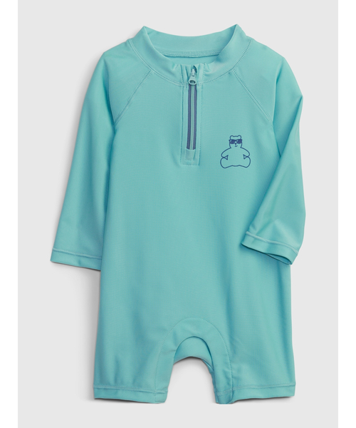 リサイクルポリエステルを82%使用。廃棄物の量を減らし、より良い商品づくりに努めています。 伸縮性のある肌触り柔らかなニット生地で作られた水着ラッシュガードワンピース クルーネック、1/4ファスナー開閉 長袖 着せ替えやおむつ替えをラクにしてくれる股下スナップボタン付き 胸にブラナンベアのグラフィック入り 優れたUVカット機能UPF50+ ※商品タグに記載の価格とサイト上の販売価格が異なる事があります。