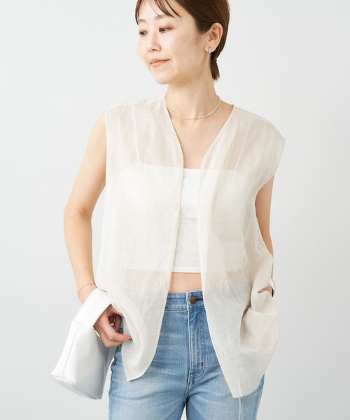 【2023SS】 R'IAM 繊細な透け感が今年らしいブラウス。 ボタン留めにしないことで、レイヤードを楽しめるよう仕上げています。 ネックのカーブを上にしたことで、ジャケットとの合わせもバランスの良い一枚。 コーディネートにクリーンな表情をプラスしてくれるアイテムです。 【R'IAM/リアム】 live for the moment 今を大切に 今を楽しむ女性に 古き良き伝統、新しいアート 様々な素敵なものに触れ 「今」の気分で着る メンズライクな素材を 女っぽいデザインに落とし込む そこにアートなジュエリーが加わり スタイルが完成する ********************** 透け感:あり 裏地:なし 伸縮性:なし 光沢感:なし 生地の厚さ:普通 ********************** ※取り扱いについては、商品についている品質表示でご確認ください。 ※ 店頭及び屋内外での撮影画像は、光の当たり具合で色味が違って見える場合があります。 商品の色味は、商品アップ画像をご参照ください。 また、お客様のお使いのPCのモニター環境などにより色味が違って見える場合があります。 予めご了承の上ご注文ください。 本体:手洗い可能