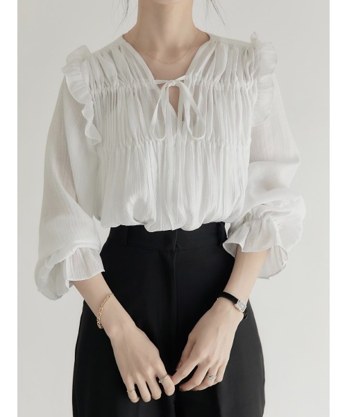フロントの3段に連なったギャザーと肩のフリルがポイントのトップス。裾に向かって広がる袖も魅力のアイテム◎フリル、リボン、ギャザーの女の子らしさが詰まったアイテムとなっています。女の子らしさをさらにアップさせたスカート合わせはもちろん、カジュアルに着こなすパンツスタイルもおすすめ◎ホワイト、ブラックの2色展開。