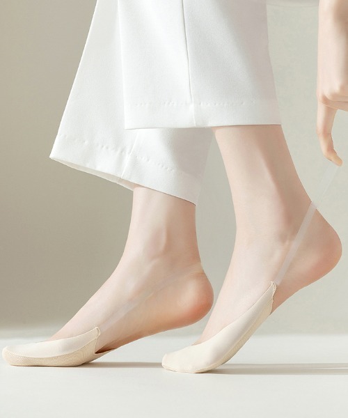 バックストラップパンプスのつま先のムレ防止、滑り止め対策に♪かかとがストラップになったパンプスを素足で履くと足先がムレてしまう!といったお悩みを解決し心地良く履けるソックスが登場しました☆ストラップが透明になっているので見た目は素足ですが、つま先部分は靴下になっているので汗をしっかり吸収してくれてムレ知らず。足裏部分には滑り止めが付いているので滑ったりせず透明バンドで靴下のズレも防ぎ快適にパンプスを履いて頂けます。★サイズ:フリーサイズ★生地:速乾性吸汗性に優れた素材★伸縮性:あり★透け感:なし★裏地:なし▼商品の色は物撮りをご参照ください。※モデル着用写真は外光の強い元で撮影しているので実際の色よりも明るく写っております。※掲載画像につきましては、撮影環境やお客様の閲覧されますパソコンや携帯電話キャリアによって、実際の商品とは多少異なったお色に見える場合も御座いますので予めご了承下さいませ。モデル着用画像はサンプルのため、色味やサイズ等の仕様に多少の変更がある場合がございます。----------------------INFORMATION----------------------▼商品のお気に入り登録お気に入りの商品やサイズ・カラーまで、お気に入りの登録をしていただきますと、そのアイテムのセールの通知、ラスト1点になった時の通知や、完売しても再入荷通知を受け取ることができます!▼ブランドのお気に入り登録新商品の発売や再入荷、タイムセールやクーポン発行のお知らせなど、Futier landがお届けするお得な情報を受け取ることができます!※通知はアプリでも受け取ることができますので、是非アプリの通知設定をお願い致します!------------------------------------------------------------