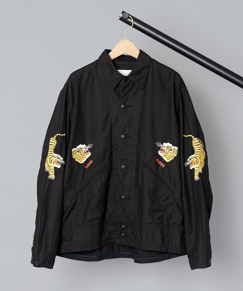 【 CAL O LINE / キャル オー ライン 】 TIGER SOUVENIR JACKET / タイガースーベニアジャケット50年代のジャケットをモチーフに、ビンテージ感のあるバックサテン生地を使用。フロントとアーム部分に施された虎の刺繍がアクセントになり、シンプルながらもエッジの効いたデザイン。ざっくりと羽織ってもシャツとしてもラフに着ていただけます。フロントボタンはチェンジボタン仕様で、カスタマイズしてより自分の好みにアレンジ可能。【カラー】ブラック 【サイズ】MEDIUM・LARGE【 CAL O LINE / キャル オー ライン 】2015年の秋冬からスタートした気鋭のブランド、キャルオーライン。カリフォルニアのオーシャンラインとアウトラインが、ブランド名の由来。デザイナー金子 敏治(Toshiharu Kaneko) 10代の頃よりアメリカンカルチャーとサーフィンに傾倒し、ブランドのデザイナーやディレクターを経て、自身の今までの経験やライフスタイル、精通するVINTAGEの要素を反映させたブランド。ヴィンテージウエアのファンにも認められる経験値と現代的なデザインとのバランスのアイテムを展開している。