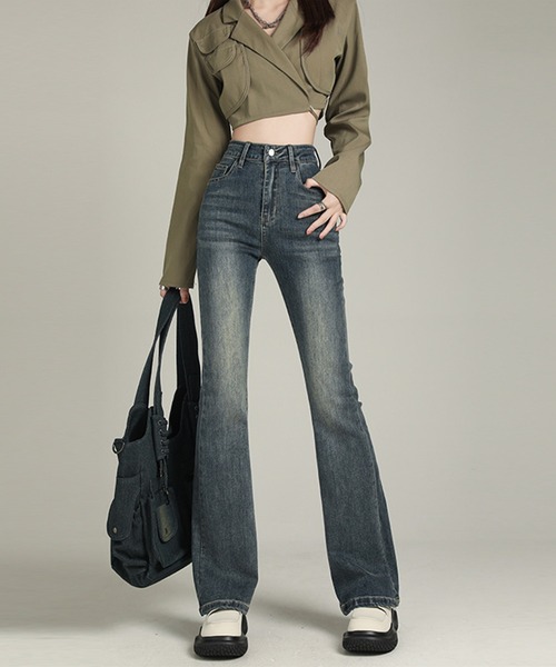 スッキリ穿きこなせるフレアデニムパンツです。 こなれ感を演出してくれるウォッシュ加工しました。 ハイウエストを活かしたINコーデで脚長効果抜群、絶妙なゆったり感のブーツカットデニム。 着る人の体型を選ばず美しいレッグラインを叶える程よいフレアシルエット。 いろんなトップスと合わせやすく、大人っぽカジュアルなstyleに。