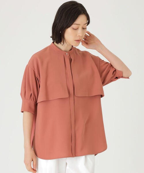 【CAST:キャストコロン 2023年春夏アイテム】 【Design】 前身頃のトレンチコートのようなガンパッチディテールが目を引くデザインブラウス。 落ち感がありシワにならないドライタッチの合繊生地で、適度な肉感の素材です。 肩をドロップさせた丸みのあるフォルムの5分袖で、内側に付けた釦を外すと少し抜け感のあるシルエットに変わります。 様々なシーンで重宝する実用性の高いブラウスです。 【Fabric】 マットな見た目とドライタッチが特徴のきれいめ素材です。 ほんの少しかすれて見えるストレッチ性のある特徴的な糸を組み合わせ、ウールのような滑らかな天然の糸形状を表現しています。 【Styling】 個性的なフロントデザインがモードなブラウス。 ボトムスを選ばなず、トップスインでもアウトでも、カジュアルからキレイ目スタイルまで多様できる優秀ブラウスです。 ●洗濯:手洗い可 ※この商品はサンプルでの撮影を行っています。 実際の商品とイメージ、サイズ、品質表示、原産国等が異なる場合がございます。 ※店頭及び屋外での撮影画像は、光の当たり具合で色味が違って見える場合があります。商品の色味は、スタジオ撮影の画像をご参照ください。
