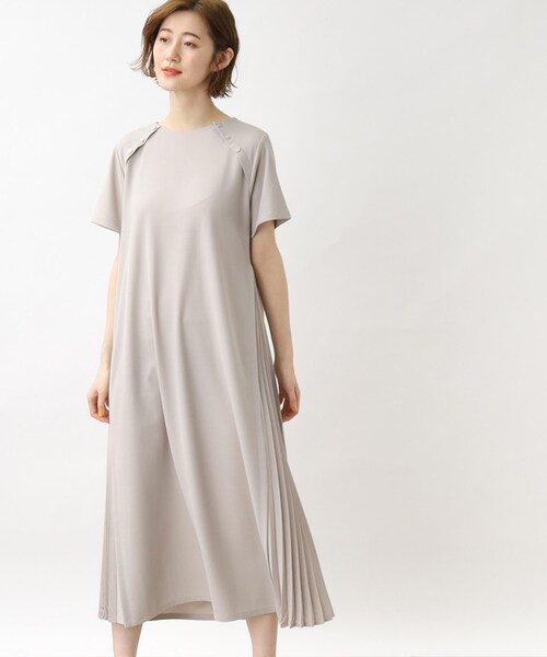 上品オシャレなプリーツ切替えワンピース! 【デザイン】 清涼感あるカノコジャージ素材の、身頃の両サイドにプリーツをドッキングしたデザインワンピースです。 歩くたびに揺れる軽やかなポプリン素材のプリーツが素敵です。 肩のボタンがアクセントになり、メリハリと華やかさをプラスします。 ※ポケットなし 【素材】 ストレッチ性のあるカノコ素材で着心地も快適。 ジャージでありながら、布帛のように見えてきちんと感があるのが特長です。 さらりとした肌触りで春先から夏にぴったりな素材です。 サイドのプリーツには軽さのあるポリエステルのポプリン素材を使用しています。 ご自宅でのお洗濯が可能です。 ※裏地なし ※ナチュラル(050)はプリーツ部分にやや透け感があるため、インナーの着用をおすすめします。 【スタイリング】 簡単にスタイルがキマる1枚着のワンピース。 夏には1枚着として活躍しますが春・秋にはカーディガンやブルゾンを羽織ったスタイルもおススメ。 長いシーズンで活躍するワンピースです。 こちらの商品は主に夏に着用いただける商品です。 モデル情報:身長166cm B80 W59 H86 着用サイズ:02(M) 店舗へのお問い合わせ商品番号:768-56027 ●製品寸法: 01(S):着丈115cm B95cm 袖丈19cm 肩幅37cm アームホール21cm 02(M):着丈117cm B98cm 袖丈19cm 肩幅38cm アームホール22cm 03(L):着丈119cm B101cm 袖丈20cm 肩幅39cm アームホール23cm 04(LL):着丈121cm B104cm 袖丈20cm 肩幅40cm アームホール24cm 05(3L):着丈123cm B107cm 袖丈21cm 肩幅41cm アームホール25cm 備考: