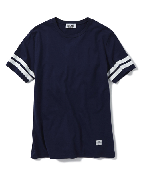 袖にラインプリントの入った、シンプルなデザインのフットボールTEE。天竺素材を使用なのでサラッとした肌触りで通気性がよいのが特徴。 model:身長180cm 着用サイズ:M