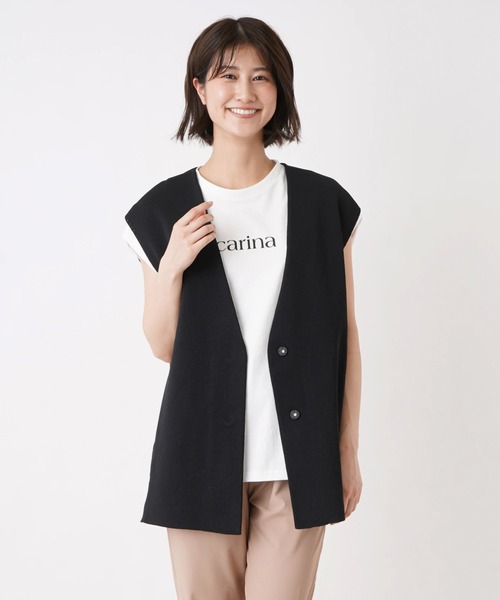 シャープなVネックが顔周りをスマートに引き立ててくれる、セミロング丈のニットベスト。 シャリ感のある爽やかなニット地を使用しています。 ヒップ下までカバーするややオーバーサイズなシルエットだから、シンプルなパンツと合わせるだけで縦のラインを意識したクリーンな着こなしが叶う1枚。 フロントはスナップボタン留めでスムーズに着脱可能。 ボタンの留め外しによりスタイルのアレンジも楽しめそうです。 ------------------------------------ <着用シーズン>春夏 <伸縮性>あり <透け感>色によりあり <ポケット>あり <生地の厚さ>普通 <お取扱い方法>ウォッシャブル(手洗い可) <裏地>なし ------------------------------------- ※商品の色味は、撮影場所や光のあたり具合、お客様のお使いの機器により色味が違って見える場合がございます。予めご了承ください。 <<ブランドについて>> 【MARILYN MOON/マリリンムーン】 デザイナーの中村法子さんが手掛けるブランド。「大人のモードフェミニン」をテーマに上品でおしゃれ感を満たす、華のあるスタイルをニットを中心に提案しています。 ※定価(税込)は、2023年06月29日のセール開始前の店舗における販売価格です。 2:肩幅45、バスト100、袖丈-、ゆき丈-、着丈73