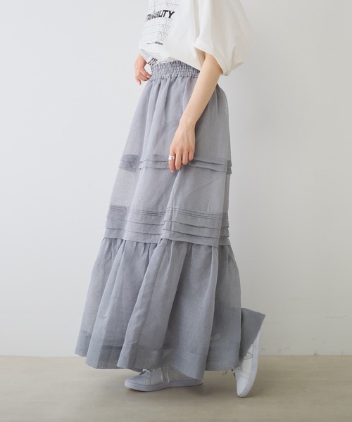 ピュアルセシン 2023 SS collection 【Town to Earth】◇ギャザースカートとナロースカートの2WAY仕様!華やかな装いを叶えるオーガンジースカート◇●商品のお気に入り登録 クーポンやタイムセール、再入荷通知やラスト1点などお得な情報を受け取ることができます。ご登録をお忘れなく◎●デザイン上品な透け感で仕上げたオーガンジー素材のスカート。タックとギャザーが入ったデザインは一枚で華やかな印象を演出。体型もさり気なくカバーしてくれます。下の方に切り替えを入れて広がりすぎないシルエットに仕上げ、大人でも着やすいデザインに。ペチコートは取り外し可能で、Iライン/ナロースカートとして単体でも使えるのも嬉しいポイント◎バックスリットが入っているため足捌きが良く、動きを邪魔しません。華やかな見た目ながら、一枚で何役もこなしてくれる優秀アイテムです。●カラー展開グレー/ブラックの2色展開。●素材薄くて軽く、ハリのある風合いのオーガンジー素材。ペチコートはスカートとして一枚でも着ていただけます。●スタイリングシンプルなトップス合わせも一気に華やかな印象にしてくれるスカートです。スウェットやTシャツなどのラフな合わせでもオーガンジー素材が女性らしさをプラス。ペチコートを外してデニムパンツにレイヤードしたスタイリングもオススメです◎ペチコートはシンプルなIライン/ナロースカートとして、ブラウスやキレイめカットソーと合わせればオンスタイルにも活躍する万能アイテムです。===============================透け感:あり(ペチコート付き)裏地:なし(取り外し可能のペチコート付き)伸縮性:なし光沢感:なし生地の厚さ:薄手【スタッフコメント】年齢:20代後半/身長:158cm/普段着用サイズ:Mサイズサイズ感:タックデザインと二重の生地で体型をしっかりカバーしてくれます。素材感:シャリ感のある涼し気な素材。ペチコートは肌触りの良い柔らかな生地です。===============================※撮影場所やお使いのモニター環境により若干お色味が異なる場合がございます。特にロケの撮影では明るく見える傾向にございます。※予約商品はサンプルで撮影をしております。若干の仕様が変更になる場合がございますので予めご了承の上ご注文くださいますようお願いいたします。