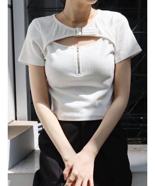 前年人気だったバックルが印象的なショートトップスです。リブ生地で伸縮性もあり着心地のいい一枚です。フロントのカッティングが女性らしい印象にしてくれます。