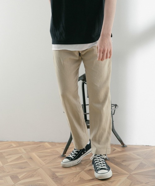 リネン混紡生地が風合いのあるテーパードパンツ。 リネンとレーヨンの混紡生地はドライな質感としなやかさを持ち合わせた快適な着心地が特徴。 すっきりとしたテーパードシルエットは上品な印象を与え、カジュアルからきれいめまで様々なコーディネートと合わせていただけます。 【2023 Spring/Summer】 ※この商品は、長時間強い日光や照明を受けますと、変色するおそれがあります。 ※ご着用や保管の際は、充分にご注意ください。 ※その他お取り扱いに関しましては、商品に付属のアテンションタグをご覧ください。 ※商品画像は、光の当たり具合やパソコンなどの閲覧環境により、実際の色味と異なって見える場合がございます。予めご了承ください。 ※商品の色味の目安は、商品単体の画像をご参照ください。 ▼お気に入り登録のおすすめ▼ お気に入り登録商品は、マイページにて現在の価格情報や在庫状況の確認が可能です。 お買い物リストの管理に是非ご利用下さい。 ----------------------------- 透け感:ややあり 伸縮性:ややあり 裏地:なし 光沢:なし ポケット:あり -----------------------------