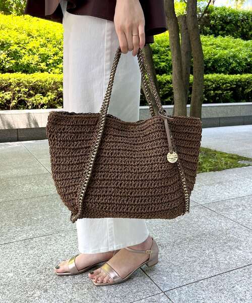 夏らしいペーパー素材のトートバッグ【デザイン】ペーパーをかぎ針編みした本体に、合皮でかがったチェーンショルダーを配した夏のコーディネートのポイントになる、涼やかなアイテム。ブラック本体にはシルバーのチェーンを、ブラウン本体にはゴールドのチェーンを使用。取り外し可能なブランドロゴ入りのメタルチャームが付き。本体口元はマグネット仕様で内ポケットが1つついています。※ポケット数:内側×1【A4ファイル収納可】店舗へのお問い合わせ商品番号:C71-16062●製品寸法:00:高さ28cm 幅(上部)43cm 幅(下部)28cm マチ15cm 持ち手上がり22.5cm 付属チャーム全長14cm 付属チャームモチーフ直径3cm備考:重量:約485g