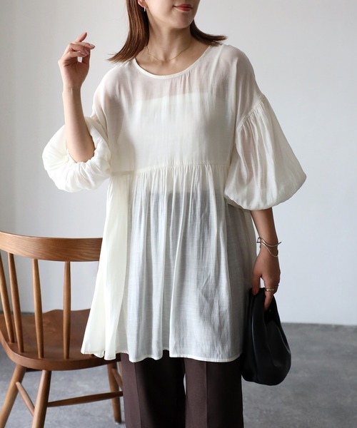 【Riberry バルーンスリーブシアーブラウス】ヘルシーな透け感のシアーブラウス♪■Styling女性らしい雰囲気のシアー素材と袖のボリューム感が魅力のブラウスです。シンプルなパンツはもちろん、デニムと合わせて大人カジュアルにもぴったり!■Detail袖口はふわっとしたバルーンスリーブに、ボディラインを拾わないティアードデザインは体型カバーにも◎■Materialさらっとした肌触りの良い素材感です。裏地:なし透け感:あり伸縮性:なし生地の厚さ:薄い※この素材は摩擦(特に湿った状態での摩擦)や雨、汗でぬれた際には他の衣料等に色が移ることがございますのでご注意ください。※商品の梱包には細心の注意を払っていますが、通販の特性上、到着時に畳みシワがついている可能性がございます。予めご了承ください。※詳しいお手入れ方法は商品タグをご参照ください。【Information】◆《お気に入り登録》がオススメ◆・「商品のお気に入り登録」で再入荷通知や、ラストの通知、セール通知も受け取ることが出来ます。・「ブランドのお気に入り登録」で新商品や再入荷など、お得な情報を受け取ることが出来ます※撮影時のライティング、ご覧になっているモニター・PC環境により、実際の商品と色味が異なって見える場合がございます。予めご了承をお願い致します。