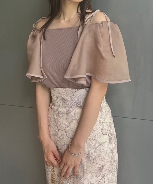 ~NICECLAUP 2023 spring Collection~ お袖のシアー感が涼しげな印象を与えるトップス。 テレコ素材なので着心地もよく、夏にも涼しく着て頂けます。 ふんわりしたフレアスリーブに、パイピングデザインがポイント。 女性らしさを際立たせ二の腕周りも華奢に見せてくれます。 肩のリボンがワンポイントになり、オフショルでの着用も可能。 スクエアネックなので首元がすっきり見えさらに女性らしい印象に。 ■オススメスタイリング ボトムを選ばずに着れるアイテムで、ミニボトム、ロングどちらも相性抜群。 カジュアルさんなら、デニムにキャップなど、カジュアルダウンさせた着こなしも今年らしくオススメです。 甘めなコーデがお好きなら、ミニボトムで合わせたコーデもオススメです。 キャミワンピースやサロペットなどのインナーにしても◎ 着回し抜群なので、お手持ちのアイテムに合わせていただけます。 ------------- 裏地:なし 伸縮性:あり 生地の厚さ:普通 生地の重さ:普通 洗濯 :手洗い ------------- ※サンプルでの撮影のため、実際のものと仕様や色が異なる場合があります。 ※室内、室外での撮影のため実際より明るく映っていたり、暗く映っていたりする場合がございます。 ※品質表示を必ずご確認下さい。 【商品のお気に入り登録】 完売カラーの再入荷や、ラスト1点のお知らせ、セールの通知を受け取ることができます。 【ブランドのお気に入り登録】 新作入荷や再入荷情報など、ブランドの情報をいち早くお届けします。 ぜひご登録ください♪