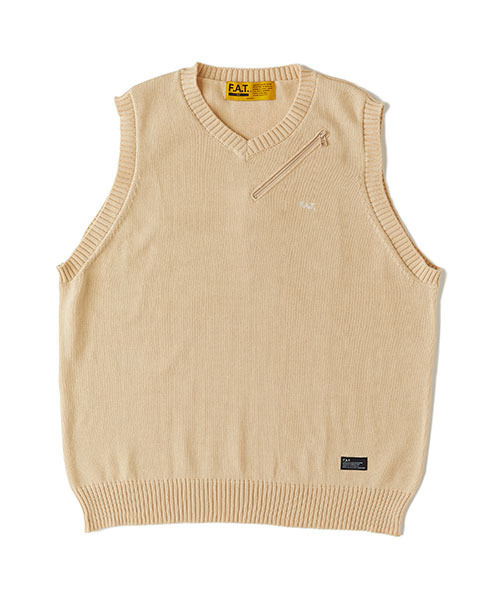 程よい肉感のニットベスト。シンプルながらも、マットな質感のポリエステル糸を使用した軽い仕上がり。浅めのVネックはカットソーをインナーに合わせてコーディネートし易さも魅力。胸の斜めジップポケットはサングラスなどを収めるのに最適。ポケット下の刺繍と裾のブランドネームが程よいアクセントに。