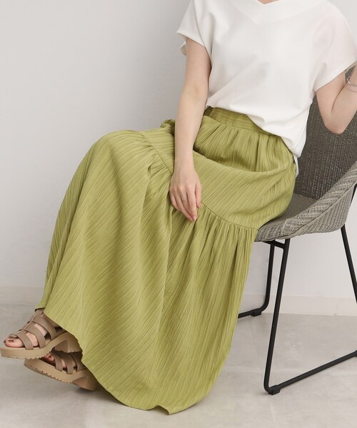 ボリュームティアードスカート! 【デザイン】 シボ感が特徴的な素材の涼し気なティアードスカート。 分量感のあるロング丈で大人可愛いが叶うデザインです。 ウエスト後ろ部分は、ゴム仕様になっているので、ラクチンにはける1着です。 ※ポケットなし 【スタイリング】 表面感のある素材なので、プレーンな無地のトップスと合わせるのがおすすめ。 きれい目なブラウスと合わせるとお出かけシーンにもマッチします。 カジュアルなTシャツやリネンシャツと合わせた大人のフェミニンカジュアルにもおすすめです。 【素材】 楊柳(ようりゅう)と言うシボ感のある素材を使用しています。 レーヨンとポリエステルの混合素材なので、シワになりにくく、さらさらとした軽い肌触りです。 伸縮性もあります。 モデル情報:身長163cm B81 W56 H82 着用サイズ:02(M) 店舗へのお問い合わせ商品番号:741-76023 ●製品寸法: 02(M):W67~98cm 総丈92cm 03(L):W70~101cm 総丈92cm 04(LL):W73~104cm 総丈94cm 備考: