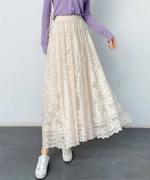 贅沢にレース生地を使用し、たっぷりとしたフレアシルエットに。足元の透け感が軽やかなで夏気分を高めてくれます。ウエストは総ゴム仕様で楽ちんな穿き心地とキレイなフィット感を演出。甘めのコーデから大人カジュアルまで、あわせるトップスで幅広いコーデが楽しめます。★ご注意・異物の混入につきまして生産工場にて商品の検品を行っておりますが、異物の混入がある場合がございます。必ずご使用前に商品のご確認をいただけますようお願い致します。・色落ちにつきまして洗濯の際に移染する場合がございますので、濡れたまま放置したり、水につけ置きすることや他の衣類との洗濯はお避け下さいませ。・異物の混入による怪我や、色落ちによる他の物への染色等の損害につきましては責任を負いかねます。予めご了承を頂いた上、お買い求めを頂けますようお願い致します。◆平置き・メジャー採寸、大量生産品のため、個体によりサイズに若干の誤差が生じる場合があります。予めご了承ください。◆掲載画像につきましては、撮影環境やご覧になられる環境(モニター)などによって、実際の商品の色味と若干異なる場合がございます。あらかじめご了承下さい。◆ニット/デニム製品は生産の過程上、繊維の混紡・テカリ・色ムラが生じる場合がございますが、品質上問題はございません。◆多少の糸のほつれ・裁断上のズレなどがある場合がございます。予めご了承下さい。◆製品によっては、生地の特性上、縮む場合がございますので、洗濯時はご注意下さい。