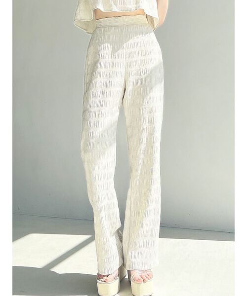 毎年大人気のシャーリングセットアップが今年も登場!▽デザイン▽ハイウエスト×ストレートのシルエットで足が綺麗に見え、足長効果抜群。楊柳加工の施された生地を全体に使用し涼しげな印象に。シルエットにこだわりながらもヒップラインはカバーでき程よくリラックス感のあるパンツです。ウエストはバックにゴムを入れストレスフリーに着用でき、ハイウエストなので1枚でスタイルアップできる1枚です。▽カラー▽白・黒・ベージュの3色展開。▽スタイリング▽シャーリングトップスとのセットアップ着用がオススメ◎ハイウエストなので様々なトップスとの相性も良く、キャミやTシャツとのコーデもオススメです♪【セットアップアイテムはコチラ】152340466501:シャーリングブラウス