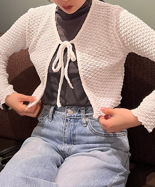 トレンドのボレロカーディガンです✨ 凹凸のある素材が今っぽく、今季コーデに取り入れたいアイテムです! 風を通す素材感で、肌触りもさらっとしているのでこれからの季節長く着用できます! コーデにプラスするだけでトレンドライクなスタイリングに仕上がります!