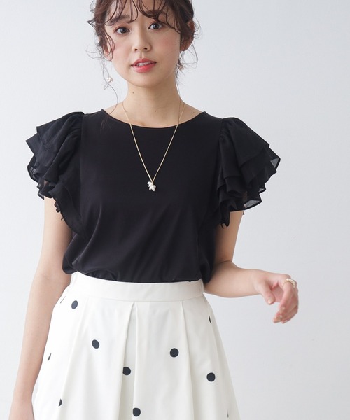 ふんだんなフリル袖が華やかな、一枚で主役級トップスブラウス見えしてくれる、高見えTシャツ♪~POINT~・シアー異素材のラッフルフリルがついたデザインジャージトップス。・3段のボリューミーなラッフル袖で、華やか見え・小顔効果・二の腕華奢見せ効果も期待できる!・シンプルにデニムあわせも可愛く、スカートで合わせればとびきり特別感のあるコーデに♪・オフィスや通勤にも使い易い、落ち着いたカラー展開がうれしい◎【ディティール・機能】・身頃は肌触りなめらかな、60シルケットスムースバイオを使用。・身頃はUVカット効果・接触冷感素材を使用しています。手洗い可能です。※この製品は、太陽光線中の紫外線(UV)を通しにくくします。この効果は永久的ではありません。【スタッフコメント】・maki(163 )ふわふわフリル袖に思わず一目惚れした、リアルバイアイテムです!Tシャツ、と言うにはもったいないくらい高見えしてくれるカットソー。カジュアルなTシャツと違って、上品なイメージに仕上がるので、オフィスカジュアルにもおすすめです♪こちらの商品は主に夏に着用いただける商品です。モデル情報:身長166cm 着用サイズ:38(M)店舗へのお問い合わせ商品番号:508-16505●製品寸法:36(S):着丈54cm B88cm 裄丈28cm38(M):着丈55cm B91cm 裄丈29cm40(L):着丈56cm B94cm 裄丈30cm42(LL):着丈57cm B98cm 裄丈31cm備考: