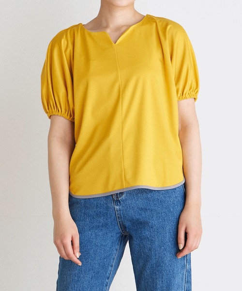 光沢のあるスムース素材を使用したトップス。ドルマンスリーブにたっぷりのギャザーで女性らしさをプラス。袖下から裾にあしらった配色パイピングがアクセントになります。パンツでもスカートでも合わせやすいレングスとボディサイズに仕上げています。 透け感:なし 伸縮性:なし 裏地:なし 光沢:ややあり ポケット:なし ■サンプル撮影商品■こちらの商品はサンプルでの撮影となっております。実際の商品とは、サイズや色味、素材、デザイン等の仕様が若干変更になる場合がございます。