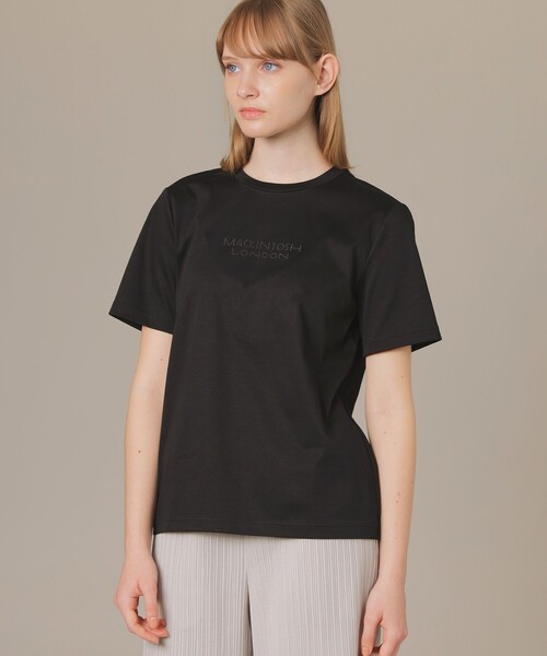 【ウォッシャブル】【着用推奨シーズン:春・夏】 <素材説明> 糸ムラの少ないきれいな糸を丁寧に編みたてたフラットできれいな素材です。シルケット加工を施しハリと光沢をもたせた透け感の少ないしっかりした風合いです。 <デザインポイント> ブランドロゴをスタッズで表現したトップスです。生地とトーンを揃えたスタッズがアクセサリーの様に見えクールな印象です。 モデル:H174 B78 W59 H89 着用サイズ:38