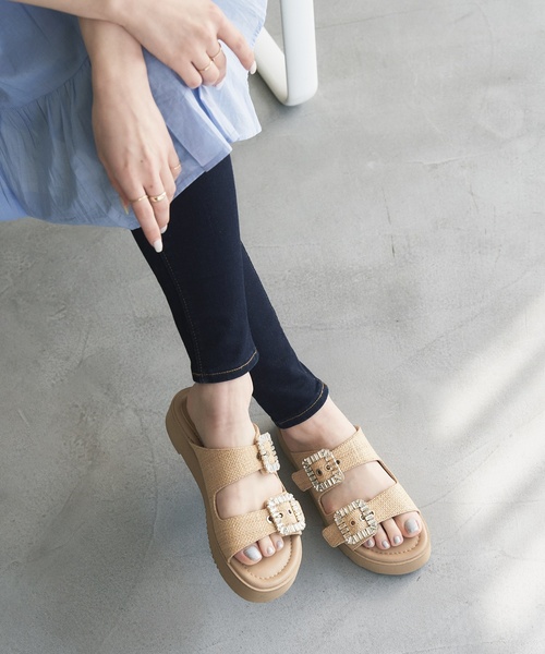 -LE TALON 2023SS- 夏のカジュアルサンダルの定番、Wベルトサンダルをブラッシュアップ。 メンズライクなイメージが強いWベルトサンダルですが、バックルにビジューを採用し女性らしく履ける1足に。 きれいめな印象が強いビジューバックルに、ナチュラルなパナマ素材やサテンを掛け合わせて、ソールにもボリューム感を出しトレンド顔に仕上げました。 素足にはもちろんですがソックス合わせも楽しめるサンダルです。 ********************** 【スタッフ着用コメント】 《スタッフH》 普段サイズ:23.5/着用サイズ:M サイズ感: Mでぴったり。 履き心地:Mサイズを素足で履いて丁度よかったです。 横幅は割とゆったり目なので、幅広めですが窮屈感は 感じませんでした。踵があいたタイプですが甲が深い ので、安定感のある履き心地でした。薄手のソックスなら いつものサイズでも履けそうです。 ********************** *カラーにより素材が異なります。 ブラックA 甲材:人工皮革 ベージュ・ピンク 甲材:合成繊維 *ソールの厚みはMサイズで、つま先部分で約2.5cm、かかと部分で約3.5cmです。 *ビジュー部分は衝撃や摩擦にお気を付けください。 *店頭・屋外での撮影画像は、光の当たり具合で色味が違って見える場合があります。商品の色味は、スタジオ撮影の画像をご参照ください。