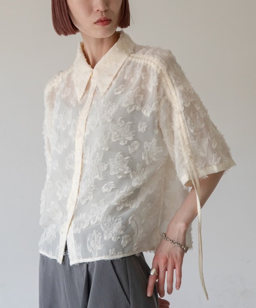 【再入荷】2023 VACANCY SUMMER COLLECTION ◆FABRIC ドロストデザインを使用して、 様々着方をお楽しみいただけるドロストジャガードシアーシャツ。 肩部分にドロストが付いており、絞っていただくと 袖の長さを調節していただけます。 絞ることでシャーリングのようなシルエットになり モードな印象に。 前を開けて羽織としてもお使いいただけるのも嬉しいポイントです◎ WHITEはフローラル柄、 GREEN、NAVYは幾何学ストライプ柄のジャガード仕様となっております。 ◆STYLE デザイン性があり工夫次第で様々は着こなしが可能なアイテムです。 モードな着こなしであれば、BLACKのワイドパンツと合わせるときれいめな仕上がりに。 夏はドロスト絞りに加えて、裾を結んでワンピースと合わせると リゾート風なコーディネートもお楽しみいただけます◎(参照画像ございますので、是非そちらもご覧ください。) ・・・・・・・・・・・・・・・・・・・・ 透け感:あり 裏地:なし 伸縮性:なし 光沢感:なし 生地の厚さ:薄め ・・・・・・・・・・・・・・・・・・・・ 【お買い物をお楽しみいただく為に】 ▼お気に入り登録をオススメ致します▼ ♡をクリックして下さい。 ・《商品のお気に入り登録》で再入荷通知や、ラスト1点の通知、セールの際の通知も受け取ることができます。 ・《ブランドのお気に入り登録》で新作商品や再入荷など、お得な情報を受け取ることができます! 【ATTENTION】 ※画像の商品はサンプルです。 実際の商品と色味、仕様、加工、サイズ、素材等が若干異なる場合がございます。 ※撮影場所やお使いのモニター環境により若干お色味が異なる場合がございます。 ※製品によっては染料の特性上、湿った状態や汗をかいた状態での長時間の放置、または摩擦により、他のものへ色移りする恐れがありますので、着用時にはご注意下さい。 ※お洗濯は洗濯ネットを使用し、他のものとの混合洗いはお避け下さい。色落ちや色移りの原因となります。 タンブラー乾燥はお避け下さい。 ※風通しがよく、湿気の少ない日の当たらない場所で保管して下さい。 ※また製品加工上、お手元に届く際に匂いが生じる場合がありますが、 ご使用を続けていく事により匂いは軽減されます。 ※ご注文いただいた予約商品のお届け時期の確認は、注文履歴ページより行えます。