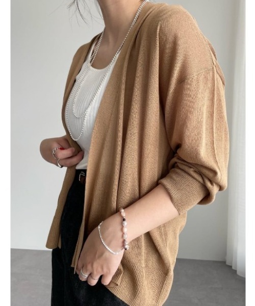 COOL TOUCH FABRIC 触れるとヒンヤリする接触冷感シリーズが今年も登場!!接触冷感でさらりと着用できるカーディガン。ボタンレス仕様で手軽にスタイリング出来るのも魅力。ヌケ感のあるゆったりシルエットは、重ね着も楽にすることができます。シンプルな無地で着回し力も高く、ワードローブの定番アイテムとしても大活躍してくれる1着。透け感[やや有り] 裏地[無し] 伸縮性[有り] 光沢感[無し] 生地の厚さ[薄手] 付属品[無し] ポケット[無し] 接触冷感シリーズ一覧はこちら●製品寸法:F:バスト58cm 着丈56cm/61cm 袖丈47cm 肩幅57cm 裾幅32cm備考: