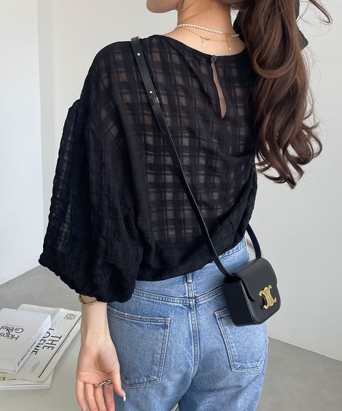 うっすらと透けたチェック柄のシアー感が着映える ボリュームスリーブ・ブラウスが入荷しました♪ くしゅっとした凹凸感のあるシボ感のある、 チェック柄のシアー素材が涼しげな1枚。 袖口ゴム仕様のたっぷりとしたボリューム袖に ドロップショルダーで、抜け感のあるシルエットに。 首元は、程よいボートネックで上品に。 裾はゴム入りで、自然とブラウジングしたような着こなしが可能です。 シアー素材で、隠し過ぎない体型カバーが叶う! 涼しげで1枚でパッと華やかなコーデに仕上がる、 楽ちんオシャレアイテムです。 ※撮影時のライティング、ご覧になっているモニター・PC環境により 実際の商品と色味が異なって見える場合がございます。 ご了承の上お買い求め下さい。 素材: ポリエステル100% ≪備考≫ 伸縮性:なし 透け感:あり 生地の厚さ:薄手 肌ざわり:さらっとしている その他:クシュッとしたシボ感・凹凸感あり 生産地:中国 洗濯機:可 ドライクリーニング:可 ※袖部分のみ裏地あり andme アンドミー 春 夏 春夏 夏服 春服