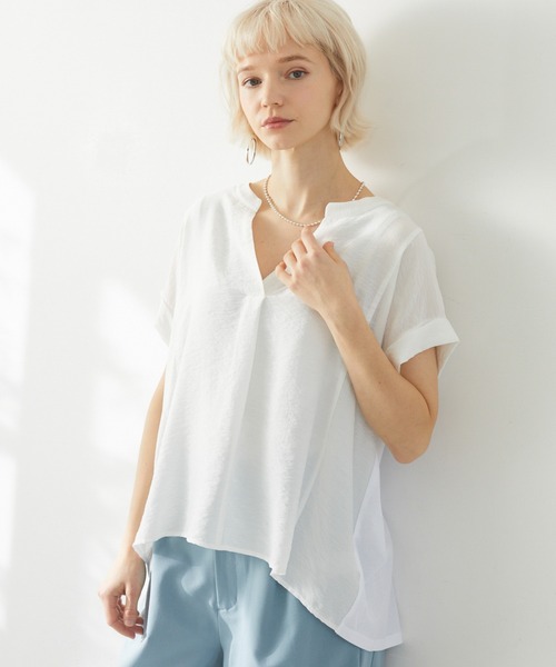 気張り過ぎない上品スタイルに、プルオーバーブラウス。 ○POINT ・メインはガーゼのように軽く、柔らかい生地にとろみを加えた上品素材で着心地抜群。 ・背面は伸びの良いカットソー生地と切替になっており、着脱も楽ちんです。 ・首元はキーネックで顔回りをすっきりと見せてくれます。 ○STYLING ・デニムやカラーパンツで合わせれば大人カジュアルスタイルに。 ・タイトスカートやセンタープレスパンツと合わせれば、オフィスにもおすすめです。 裏地:なし 光沢:微光沢 伸縮性:一部あり 透け感:あり 生地の厚さ:薄手 ポケット:なし ※照明の都合上、多少の色ブレが生じてしまう可能性がございますので、予めご了承くださいますようお願いいたします。 --------------------------------------------------- ●お気に入り登録でお得情報を手に入れよう! 「商品のお気に入り登録」をすると、再入荷通知や、ラスト1点の通知、セールの通知など、お得情報が届きます。 また、マイページでいつでも確認が可能になります。 「ブランドのお気に入り登録」をすると、新商品や再入荷、などいち早くブランドの最新情報をお届けします。 ぜひ、ご利用ください。 ----------------------------------------------------