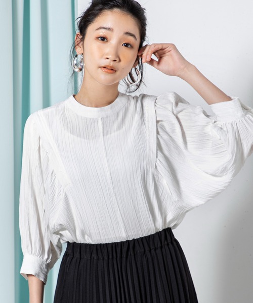 ◆ pointタックデザインから広がるボリューム袖が特徴的なブラウス。表面にシボのある生地を使用し、さらりとした肌触りで清涼感のある印象に。肩の内側からタックを施し肩幅を強調しにくく、たっぷりとギャザーを寄せた袖パフスリーブで女性らしいシルエットをつくります。襟は首に沿うスタンドカラーできっちりと魅せつつ、後ろの涙あきで抜け感を演出します。◆ fabric透け感:オフホワイトは少々あり伸縮性:なし裏地:なしポケット:なし洗濯方法:手洗い◆ coordinateディテールの詰まったデザインなので、スカートは足首の出る丈のものを合わせると軽やかに仕上がり、バランスをとりやすいです!ヒップにかかる着丈の為、ベルトでウエストマークをした着方もおすすめです。◆ model size■オフホワイト | MODEL(メイン画像):身長 165cm / B 80cm / W59cm / H85cm■ブラック | MODEL(メイン画像):身長 165cm / B 80cm / W59cm / H85cm■グリーン | MODEL(メイン画像):身長 165cm / B 80cm / W59cm / H85cm◆ staff voiceとろみがあって抜け感たっぷり!ボトムにインしてもアウトでもリラクシーなボリューム感が保たれるのでボディラインが気になりません。若干伸縮性があるので着用時も着心地も楽々◎#ボリューム袖 #エフォートレス #骨格ウェーブ≪お気に入り登録≫再入荷や、セール情報などお知らせを受け取ることができます!≪Instagram:@millioncarats_official≫新作やセールなど最新情報をチェック!