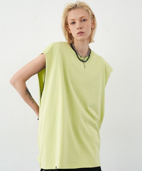 【AIVER 16/-ウォッシュ天竺ワイドN/S TEE】 16/-の太目の糸を使用したしっかりとしたコシのある綿生地を採用。 生地の段階でウォッシュをかけている為、ゴワゴワせず厚みがありながらもふわっとした質感が特徴。 また洗濯しても縮みにくく耐久性のあるタフな仕上がり。 生地自体は綿100%で肌触りは滑らかで柔らかい着心地。 単色無地のシンプルなTシャツの袖口を大胆にカットしたノースリーブトップス。 アームホールは約33cmと大きく脇下に余裕のあるデザイン。 切りっぱなしの袖口はほつれない様に糸処理を施した仕様。 通常よりも身幅をプラス10cmほど大きく仕立てたゆったりなワイドシルエットが特徴的。 右側の裾にはワンポイントにAIVERのピスネーム付き。 カラーは定番のホワイト、ブラック、チャコールグレーにくすんだイエローの4色展開。 <同じデザインのシルエット違い16/-ウォッシュ天竺セミクロップドN/S TEE(問い合わせ番号/ACZUC0523002)もあります。> ※画像つきましては、光の反射によって実物と色味が異なって見える場合がございます。 ※繊維製品の為1~2cmの誤差がある場合がございます。予めご了承下さい。 <商品のお気に入り登録> 再入荷、残り1点、セールなどの通知を受け取ることが出来ます。 <ブランドお気に入り登録> 新商品や再入荷、ショップのおすすめトピックスなど、 いち早くブランドのお得な情報を受け取ることが出来ます。