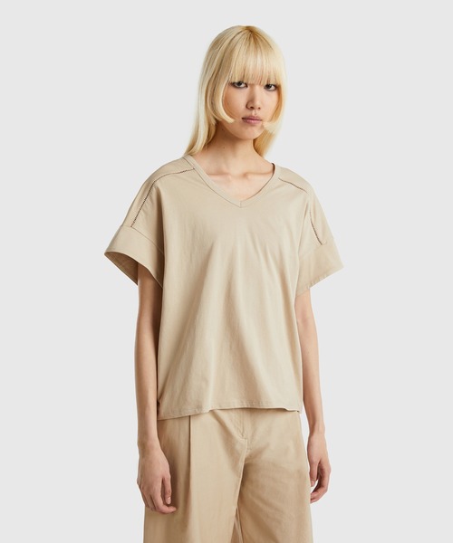 フレアスリーブや肩周りのラインが目を引く半袖のカットソー。前後Vネックのデザインで軽やかな雰囲気を演出します。適度にゆとりを入れたシルエットによって着心地も快適。コットン100%素材のため吸水性や通気性にも優れています。 まずは【お気に入り登録】を。商品の情報がお届けしやすくなりました♪ ご購入後はぜひWEARへのコーディネート投稿♪ お待ちしております。