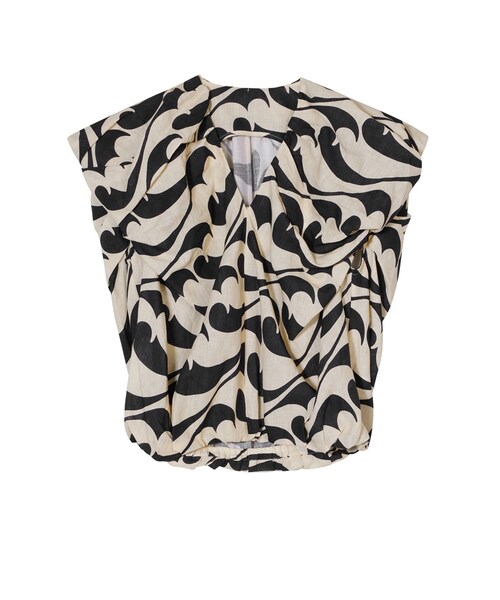 【DESCRIPTION】 海波のシルエットプリントのブラウス。全体的にギャザーを寄せて、 夏のロマンティックな雰囲気を演出している。ハイウエストパンツやスカートと合わせて、黄金比率でスタイルアップ。【MATERIAL】麻100%