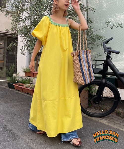 \トレンドのワンショルダーで肌見せ/ ポップな配色が目を引く個性派2WAYワンピ ▼ポイント ・ヘルシーな雰囲気を演出するワンショルダー ・ポップな配色がハロサンらしい一枚 ・ボリュームスリーブが顔周りを華やかに ・パフスリーブ側をオフショルにして2WAYで着用可能 ◇サイズ感:ゆったり ◇着心地:★★★☆☆ ▼スタッフレビュー ※骨格は自己診断になります。 【158cm / size:F / 骨格:ナチュラル】 足首にあたるほどの着丈にふわっと広がるAラインシルエットです。デザインのあるキャミソールや夏場はスイムウェアの上から着てヘルシーでシーズン感のあるコーディネートがおすすめです。明るいカラーに気分の上がる一枚です。 ------------------------------------------------------ 透け感:なし 伸縮性:なし 裏地:あり 光沢:なし ------------------------------------------------------ 家庭洗濯:30℃限度/洗濯機[非常に弱い] 漂白:不可 タンブル乾燥:不可 アイロン:低温110℃まで※スチームなし クリーニング:石油系溶剤による弱いドライクリーニング可、非常に弱い処理によるウェットクリーニング可 ------------------------------------------------------ 【HELLO.SANFRANCISCO/ハローサンフランシスコ】 西海岸を代表するサンフランシスコ。年中暖かく、穏やかでフレンドリーな都市。少し懐かしさを感じる柄やアイテムを今の女の子に向けて提案。メンズライクな素材を女の子が着るシルエットに落とし込んだアイテムなどトレンドに敏感でいろんな気分に合わせて、服を選ぶ女の子のためのシリーズ。 ------------------------------------------------------ ※着用、お取り扱いの際は、商品についている品質表示とアテンションタグを必ずご確認下さい。 ※画像の商品はサンプルです。実際の商品と仕様、加工、サイズが若干異なる場合がございます。 ※照明の関係により、実際よりもやや明るく見える場合がございます。またパソコンなどの環境により、若干製品と画像のカラーが異なる場合もございます。予めご了承ください。 【お買いものをよりお楽しみいただく為に!!】 ▼商品のお気に入り登録(ハートマークをクリック) お気に入りアイテムの完売カラーの再入荷通知や、ラスト1点の通知、セールの通知も受け取ることができます。 ▼ブランドのお気に入り登録 新商品や再入荷など、クーポン配布などのお得な情報を受け取ることができます。