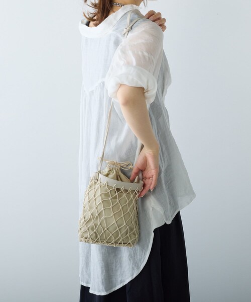 スマホと最小限の荷物が入る小さめサイズのバッグ。持ち手は結び目部分をスライドさせることで長さ調整が可能です。肩にかけてショルダーバッグとしても、短くしてハンドバッグとしてもお使いいただけ、 コーディネートの幅が広がります。中身が見えないように取り外し可能の巾着が付いているのも嬉しいポイント。付属の巾着をお持ちのポーチや巾着と入れ替えて、自分だけのアイテムにカスタマイズもできます。