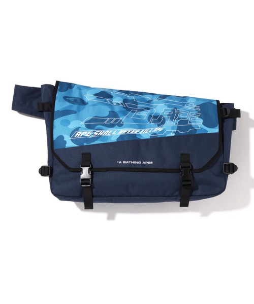 ポリエステル素材を使用したメッセンジャーバッグ。HONEYCOMB CAMO柄のフラップ部分は、スペイシーなグラフィック、BAPEロゴをラバープリントで表現したデザイン。背面はメッシュ素材、フラップ、両脇、ストラップにはアジャスターバックルを採用した仕様。2色1サイズ展開。
