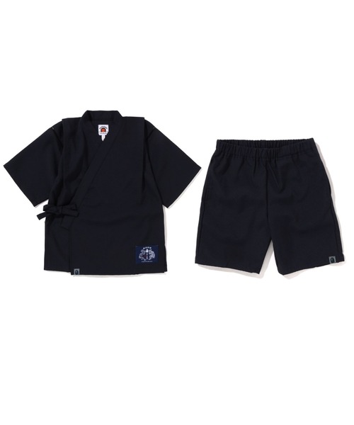 ポリエステル素材のクールマックスサッカー生地を使用した甚平。前身頃左下にJAPANカルチャー角型タグを叩きつけ、ネイビー色の背面はハーフラバープリント、グレー色の背面は染み込みプリントでAPE HEAD、謹製、漢字 / カタカナレターを組み合わせたオリジナルグラフィクを配置。ジャケットの左身頃下。パンツの左裾にJAPANピスネームを挟み込み。2色、キッズ5サイズ展開。