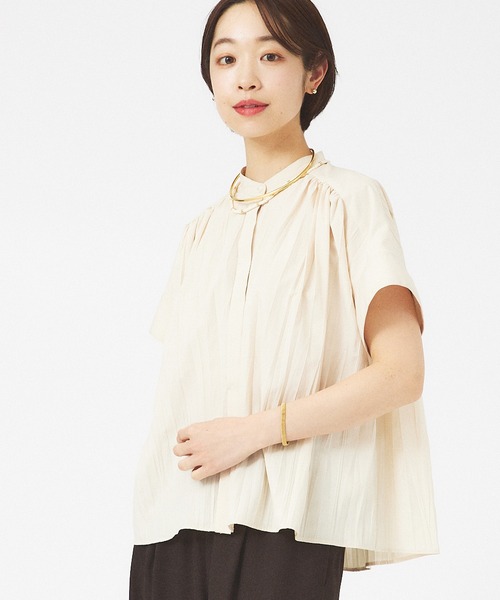 *Detail*華やかなプリーツブラウス。 適度にボリュームを持たせた身頃と、着丈を短くしたことで、全体的にバランスのとれたシルエットに。 軽やかな質感と程よいスタンドカラーが上品に、甘くならずにモードな印象に演出。 プリーツでも、比翼ボタンなのですっきり見せてくれます。 *Coordinate* 羽織としても着られる2WAYアイテム。 ワイドパンツには、アウトで着るとバランス良くて◎ テーパードパンツなど細身のパンツには、前インの着こなしがおすすめです。 休日に限らず、通勤にも着ていただけます。 ホワイト モデル:H167 B79 W58 H85 着用サイズ:F ベージュ モデル:H167 B79 W58 H85 着用サイズ:F ブラック モデル:H167 B79 W58 H85 着用サイズ:F