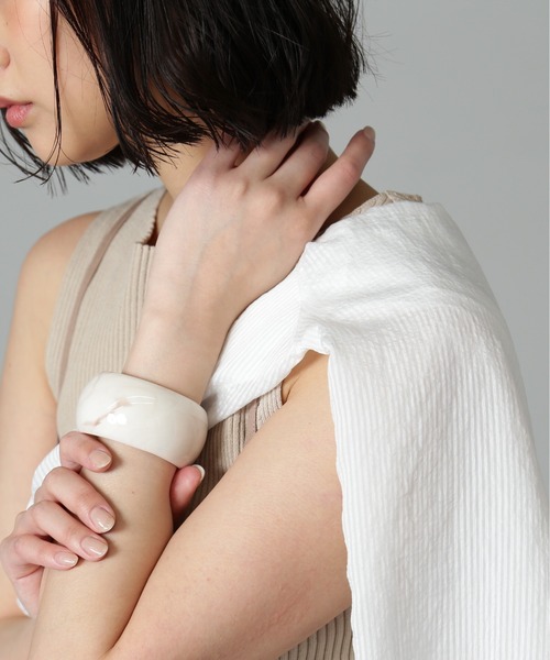 手元のアクセントになるマーブルバングル。 ほどよい幅広のバングルなので、つけるだけで手首を華奢に見せてくれます。 マーブル模様が大人っぽい印象でつけられる、ホワイトとベージュの2色展開です。 ※モデルの着用画像の場合、光の当たり具合により、実際の色味と異なって見えることがございます。