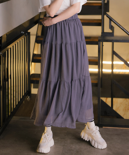 存在感抜群のティアードシアースカート■デザイン生地をたっぷり使用した、ボリューム感が目を引くロングスカートが登場!存在感抜群のデザインでコーディネートの主役として活躍するアイテムです。ふわっと軽い生地感と全体に施された切替により、軽やかな動きがでるのもポイント。ウエストはゴム仕様で、ストレスレスな履き心地〇今年らしい差し色を加えた三色展開です。■素材トレンドのシアー感のある素材。さらっとした肌離れのいい生地でシーズンムード高まる生地感です。■スタイリング存在感抜群のボリュームスカートはトップスをプラスするだけでコーディネートが完成〇コンパクトなシルエットのトップスを合わせると、メリハリのある女性らしいコーディネートに、ルーズなトップスとのスタイリングはカジュアルで抜け感のあるコーディネートに仕上がります。ウエストはゴム仕様なので、折り返せば長さの調整も可能〇カジュアルにもフェミニンにも合わせやすく、コーディネートの幅が広がります。