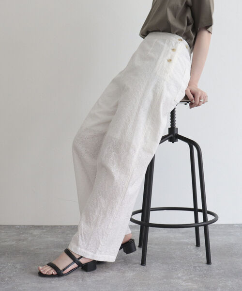 ◇fredy emue/フレディエミュ◇【2023 SS】季節感を演出するコットンレースパンツ●point・清涼感のあるコットン素材のレースパンツ・ウエスト後ろ部分にゴムが入っているのでストレスフリーな履き心地・サイドのボタンデザインもポイント・程よいワイドシルエットが安心感のあるシルエット・太ももあたりまで裏地が付いており、安心感がありながらも透け感を楽しめます・同素材のシャツ(3-0021-3-21-004)と合わせたセットアップのコーディネートもおすすめ透け感:あり裏地:あり伸縮性:なし光沢感:なし洗濯:手洗い可●お取扱い上のご注意●*商品を長くご愛用していただきたいため、アテンションタグを必ずご確認の上、着用又はお取り扱い下さい。*店頭及び屋外での撮影画像は、光の当たり具合で色味が違って見える場合があります。商品の色味は、スタジオ撮影の画像をご参照下さい。*商品画像に関しては出来る限り忠実に表示出来るよう努めておりますが、お客様がご利用のモニターの設定及び特性により、実際の商品と比較し色味に若干の誤差が生じる場合があります。*画像の商品はサンプルとなりますので実際の商品と仕様、加工、サイズが若干異なる場合がございます。◇商品のお気に入り登録◇【お気に入りに登録 ♡マークをクリック】を是非ご活用ください! 再入荷の通知や、ラスト1点の通知、セールの通知がいち早く届きます。◇ブランドのお気に入り登録◇新商品や再入荷など、いち早くブランドのお得情報が届きます。