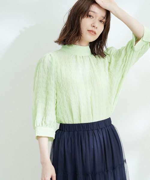 【デザイン・シルエット】ポコポコとした立体的な表面感が特徴で可愛らしい見た目が目を引くトレンド感あるブラウス。【素材感】透け感のあるシフォン素材【カラー】クロ(01)シロ(10)ライトグリーン(33)イエロー(80)【スタイリングポイント】キレイめにもカジュアルにも、ボトム次第で幅広く楽しめる万能ブラウスです。裏地:なし光沢感:なし透け感:ありポケット:なし伸縮性:あり生地の厚さ:薄手ボタン:ありその他仕様:首元後ろ涙あき季節:春〜秋※撮影時の光、お使いのモニター環境によって色の見え方が違う場合がございます。予めご了承ください。モデル身長:166cm 着用サイズ:M