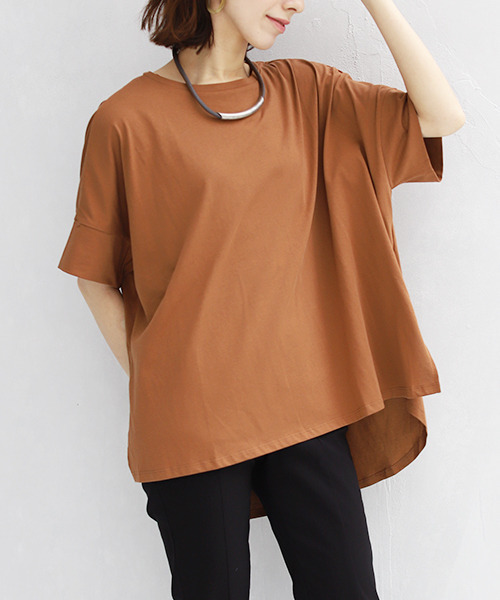涼しく快適!体型カバーも叶う。 接触冷感で夏でもひんやり、吸水速乾で洗濯しても渇きやすい! ハリのある素材でカジュアルになりすぎず綺麗見えするトップスで これからの季節重宝すること間違いなし。是非、色違い買いを! 着丈に前後差をつけ、ヒップ周りもカバー。 深めのスリットでオーバーサイズながらもスッキリ見えが叶います。 [サイズ(cm)] FREE:総丈75 バスト140 裄丈46 [お手入れ方法] 手洗いにてお手入れしてください。
