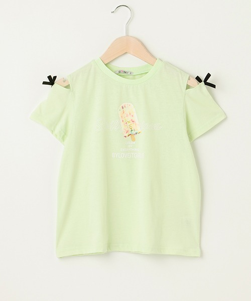 オリジナリティのあるアイスバープリントがポイントのTシャツです。肩にはスリットを入れて抜け感をプラスしました。淡い色合いを引き締めるリボン使いもポイント。軽い生地感で、毎日の着こなしに心地よくフィットします。【透け感】透けない※オフホワイトはやや透ける【生地の厚さ】普通【伸縮性】あり【裏地】なし【ポケット】なし
