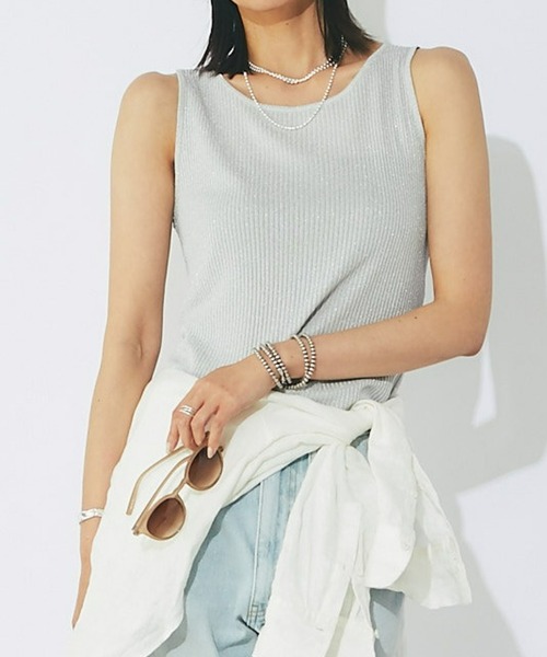 主役アイテムとしても活躍するラメニット ●POINT ・さりげないラメで個性をプラス ・1枚でもインナーにも使いやすい ・合わせやすいカラー展開 ●デザイン 上品なラメが大人っぽいタンクトップ。 シンプルなデザインなので様々なアイテムに合わせやすく、インナーやトップスとしても着ていただけます。 首回りが詰まったアメスリシルエットは、胸元の安心感がありながらもヘルシーな肌見せが叶うのがポイント。 合わせやすいカラー展開でコーディネートのアクセントに最適なアイテムです。 ●おすすめコーディネート デニムやスカートと合わせたコーディネートが今年らしくておすすめ。コンパクトなサイズ感ですっきり見えするので、ワイドパンツやフレアスカートなどのボリュームアイテムと合わせてもすっきりとまとまります。 シャツやブルゾンなどのインナーにしても、さりげなく光るラメがポイントになって◎ カジュアル過ぎず、大人でも取り入れやすいアイテムです。 ●素材 レーヨン 17% ポリエステル 83% ・さらっとしたラメ感が上品な素材 洗濯方法:手洗い可能 透け感:カラーによってややあり 裏地:なし 伸縮性:あり 生地の厚さ:普通 光沢:あり ========================== 【注意点】 ※画像の商品は光の照射や角度、お使いのモニター環境により、実物と色味が異なる場合がございます。 あらかじめご了承下さいませ。 ※入荷状況により、お届け予定が前後する場合があります。 ※お客様への発送が店頭販売より遅れる場合もあります。 ※追加生産商品は、一部の店舗、通販で販売中の場合がございます。 予めご了承下さい。 ========================== 【お買い物をもっと便利に楽しく♪】 『♡』をクリックでお気に入り登録 ✓「商品のお気に入り登録」で・・・ ラスト1点や再入荷の通知が届きます。登録して頂いた商品だけが対象となる、あなただけのタイムセールが開催されることも! ✓「ブランドのお気に入り登録」で・・・ 新商品や再入荷など、いち早くブランドのお得な情報を 受け取ることができますので、ご登録をおすすめします! ==========================