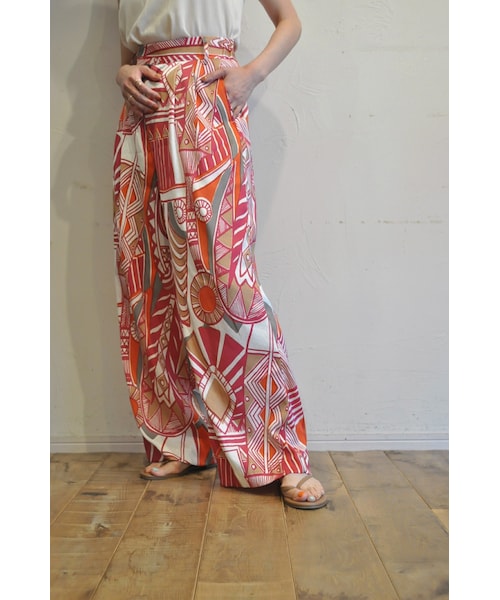 大胆なオリジナルプリント柄が特徴的なワイドパンツ。 大胆な表現の中に細かなタッチも入り、配色にも拘ったオリジナル柄です。 落ち感のある素材で、こなれた印象のワイドなストレートシルエットです。 ウェストバックはゴム仕様でリラックスした履き心地。 裏地付きなので透けません